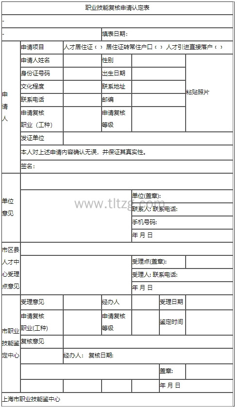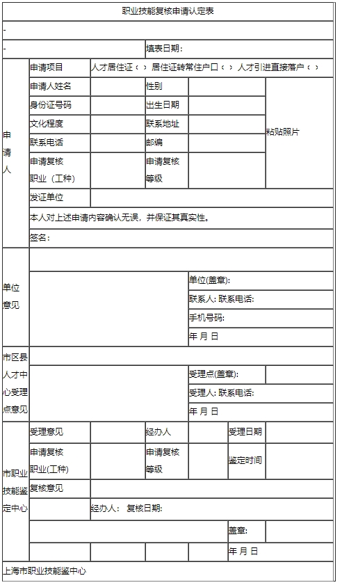 2020年上海居住证积分细则,职业技能复核申请认定表: