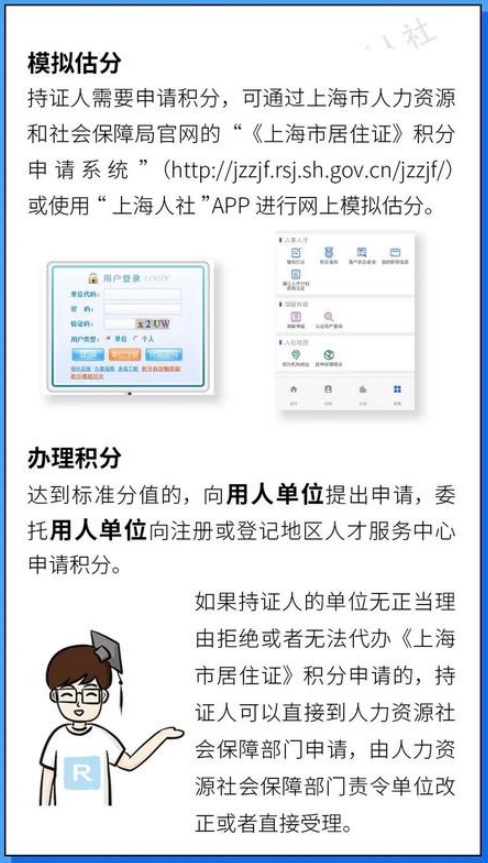 2、持有《上海市居住证》的人员可通过登录上海市居住证积分管理信息系统进行网上模拟估分,满足标准分值的人员可委托用人单位提出申请。