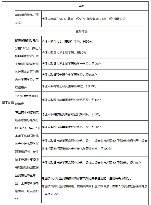 基础指标包含年龄、教育背景、专业技术职称和技能等级、在本市工作及缴纳职工社会保险年限等指标。