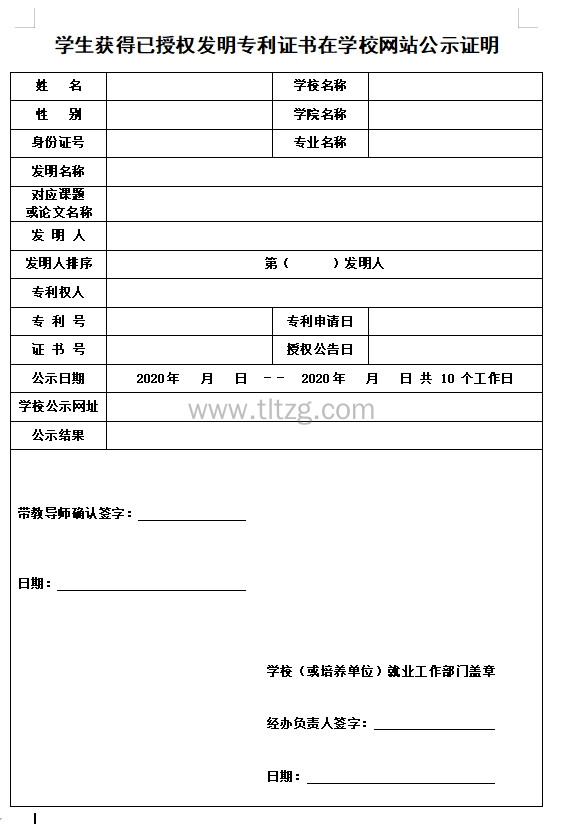 (5)(5)毕业生在本人最高学历学习期间获得的发明专利证书(毕业生应为该专利首次申请时的发明人),须提交证书复印件(验原件),并须提供对该项发明创造的实质性特点作出创造性贡献的相关材料及经学校(或研究生培养单位)就业工作部门在本校(或研究生培养单位)网站上公示无异议、由带教导师签名的书面证明材料原件(公示样表详见上海学生就业创业服务网www.firstjob.com.cn下载中心)。