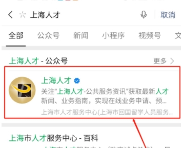 第一步:微信搜索“上海人才”公众号,然后点击进入公众号并关注(如下图所示);