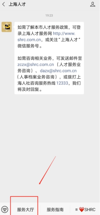 第二步:然后点击进入公众号,在公众号下方的菜单栏中点击“服务大厅”(如下图所示);