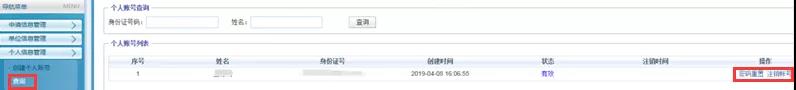 赋予个人填写权限的子key仅有上述个人信息填写功能,不具备上报申请和查询单位其他信息的功能,因此在一定程度上可以防范信息安全隐患。当然,我们还可以通过密码重置和注销账户来管理个人账户。点击左侧导航菜单【个人信息管理】下的【查询】按钮,可以看到单位账户内所有的申请人列表,单位用户可以对这些个人账号进行管理。通过点击【密码重置】按钮将指定的账号密码重置为默认密码(1234abcd),或者通过点击【注销账号】按钮来注销这个账号。