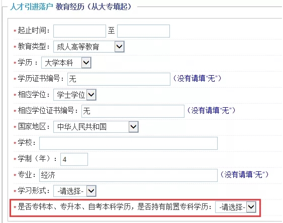 4.按照时间顺序完整填写申请人的教育经历。若主申请人最高学历为非普通高等教育专科起点的本科学历,“是否专转本、专升本、自考本科学历,是否持有前置专科学历”一项选择“是”,然后按照系统要求填写前置学历信息。