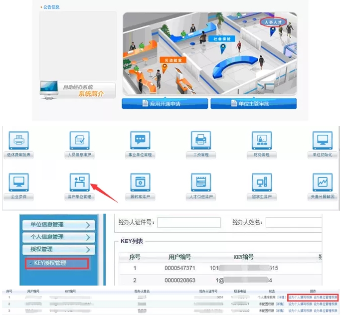 第一步:对子key进行授权管理首先,使用单位主KEY登录一网通办系统,进入“人事人才”板块,选择【落户单位管理】模块,然后点击左侧导航菜单中的【授权管理】进入系统功能页面,选择给子KEY授权。我们可以通过这种方式赋予子key个人填写权限,也可以赋予子key单位管理权限。