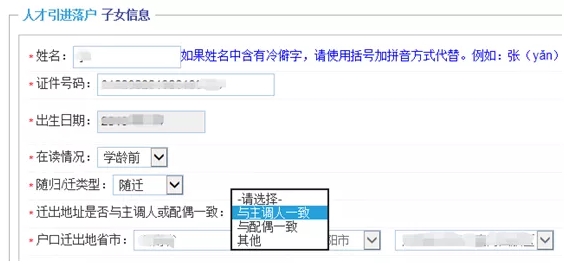 9.准确填写主申请人随迁子女的姓名、性别、证件号码、迁出及迁入地址等基本信息,必须与户口簿保持一致,否则将影响落户。小编在这里提醒一下大家,随迁子女的户口迁出地地址可以与主调人一致,也可以与配偶一致,还可以为其他地址哦!