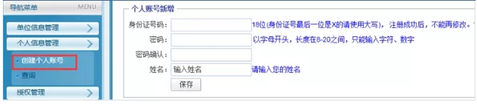 第二步:创建个人账号当子KEY被赋予个人填写权限后,可以通过点击左侧导航菜单中的【个人信息管理】选项来为落户申请人创建个人账号。选择【创建个人账号】,按照系统提示输入各项信息,然后点击【保存】按钮返回列表,这样个人账号就创建成功了。