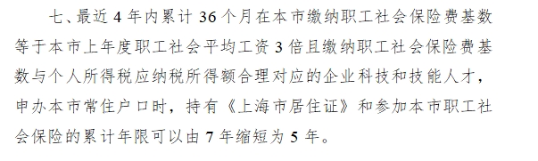 政策中提到了:最近4年累计36个月按照3倍社保基数缴纳,居住证持证和社保缴纳年限可有7年缩短为5年,我们简单称之为:3年3倍社保基数,5年居转户政策。