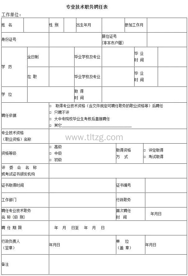提示:此表格一式三份:一份入档,一份单位保存,一份放入材料