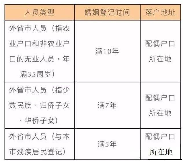 分为老人落户、子女落户、夫妻投靠。最常见的是夫妻投靠,正常情况下要10年;你是少数民族便只需7年;配偶残疾5年即可。