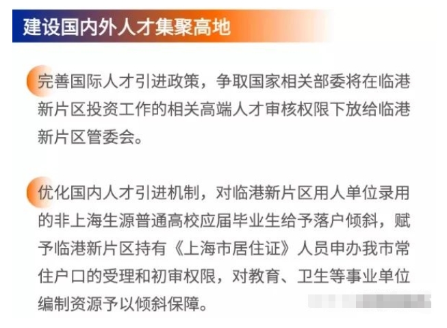 《意见》中对于大学生落户是这样表述的“对临港新片区用人单位录用的非上海生源普通高校应届毕业生给予落户倾斜。”据了解,今后只要是非上海生源的大学毕业生,毕业后在临港工作的,基本都能达到落户上海的分数标准。临港新片区对人才进一步张开怀抱。让临港新片区成为非985、211的普通大学毕业生获得上海落户的“首选地”!