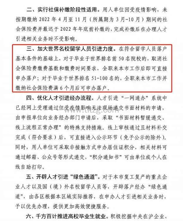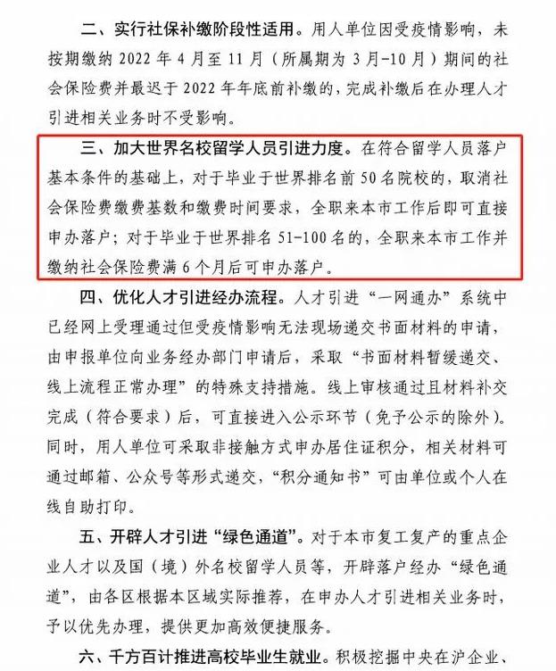 通知的第三项提及,上海为复工复产,发挥人才对于经济与社会发展的积极作用,将加大世界名校留学人员引进力度,放宽来沪工作留学生的落户政策!
