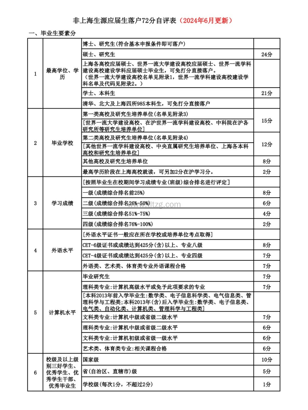 硕士、研究生24分;学士、本科生 21分;其他各加分项分别是毕业学校、学习成绩、外语水平、计算机水平等等。其中略有小变化,出现在重点领域人才方面。