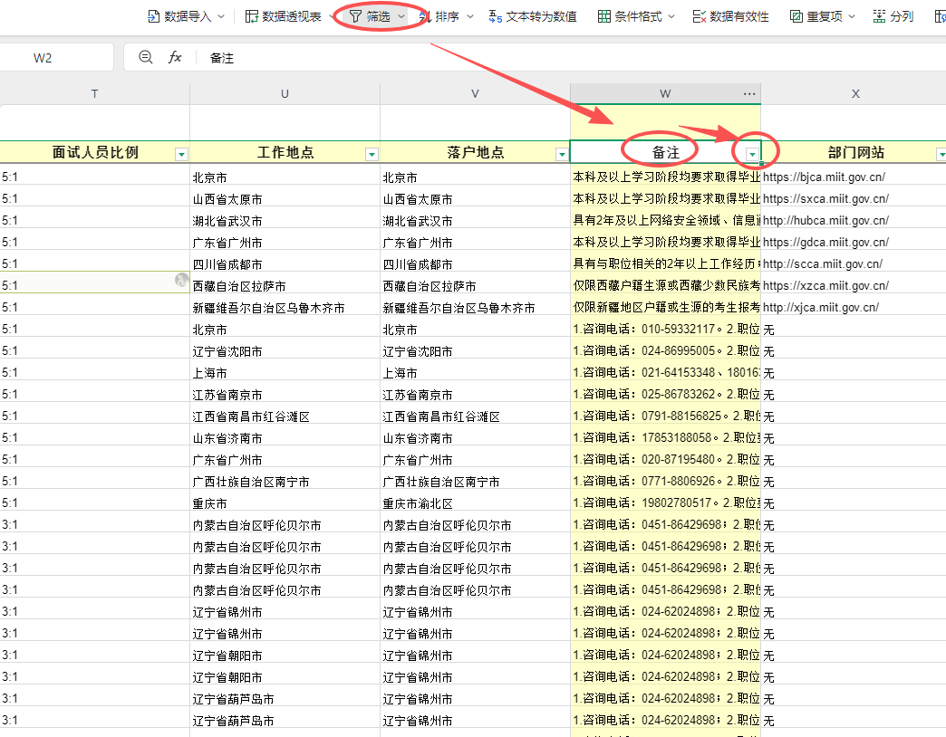 打开国考岗位表,选择【备注】栏,点击【数据】→【筛选】点击“备注”一栏的倒三角键