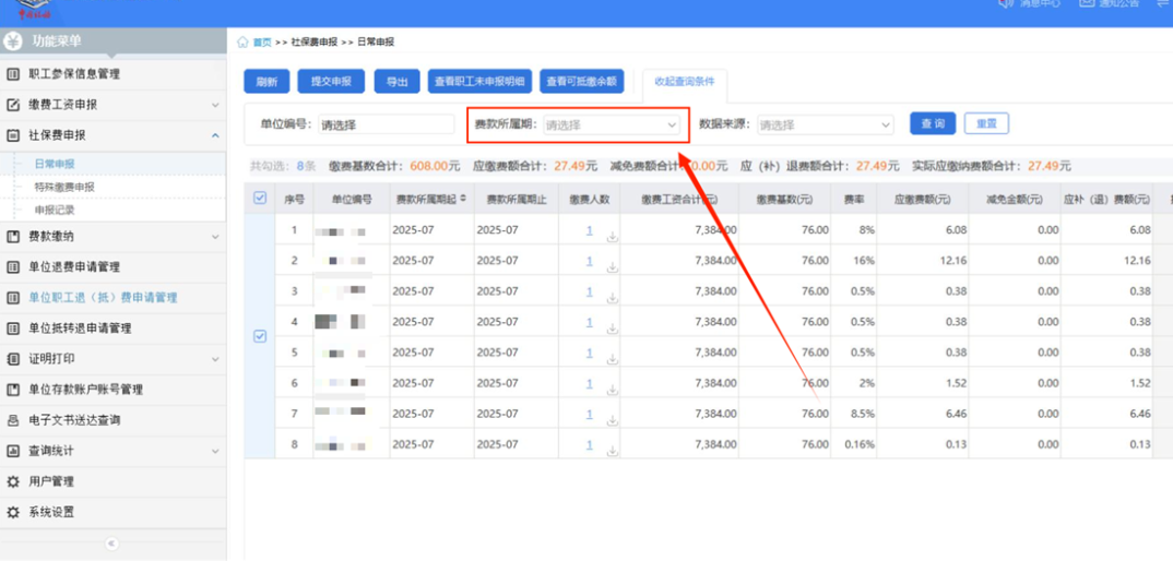 第二步【费款所属期】选择2025年7月、2025年8月,勾选调整补差数据并进行申报。