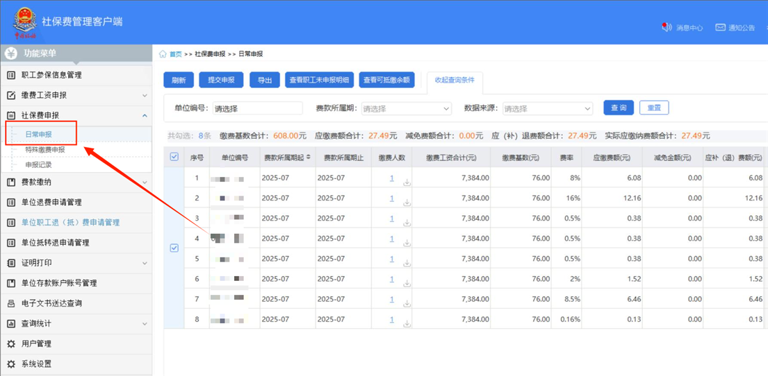 第一步 登录后进入【社保费申报】-【日常申报】模块。