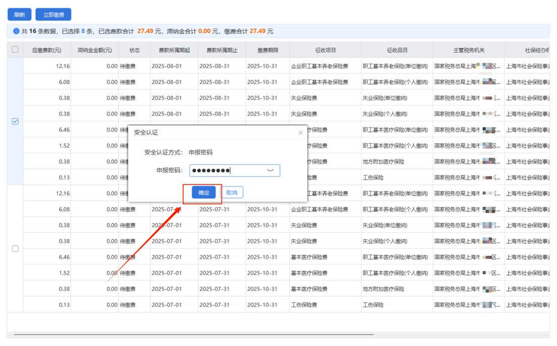 第四步勾选应缴费款,点击【立即缴费】,确认扣费险种、金额是否正确后完成缴费。