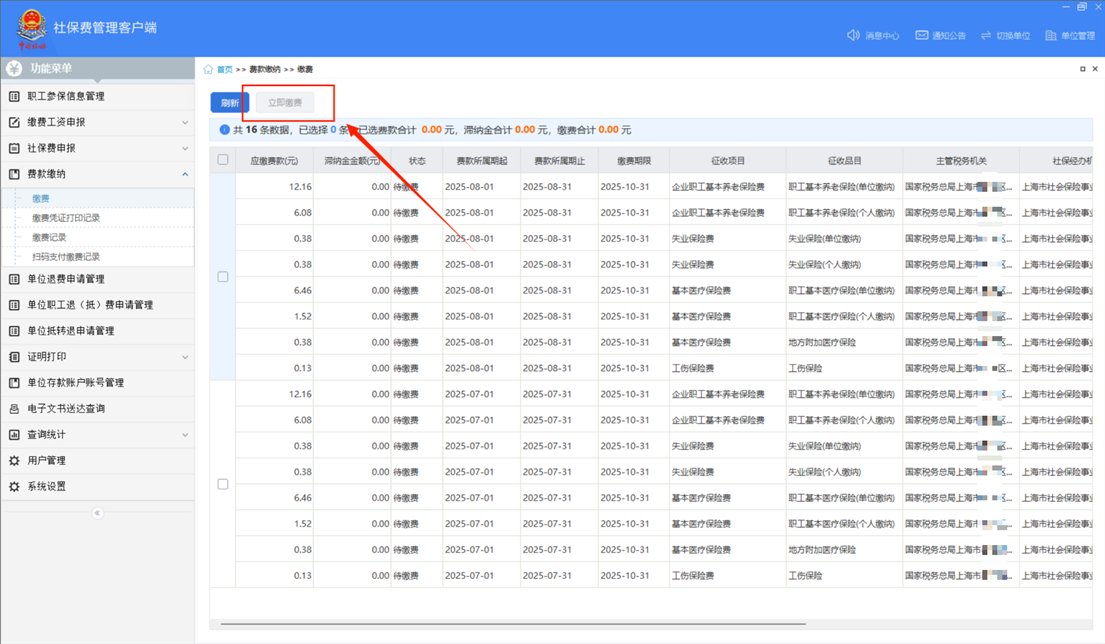 第三步申报后点击进入缴费模块的【费款缴纳】功能,点击【缴费】。