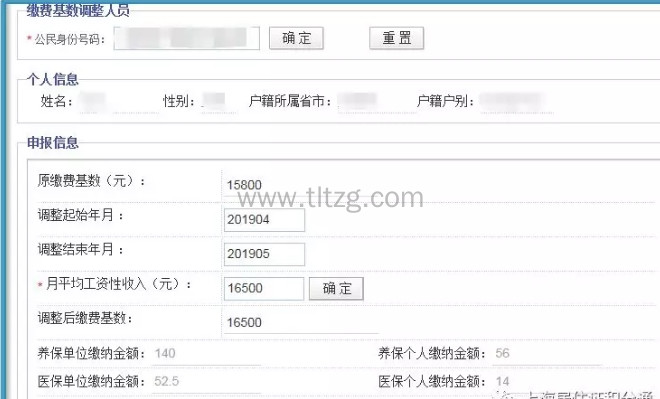 系统识别出来身份信息后,会跳出该人员原缴纳基数。以本案为例,因需保持在2倍以上,所以其原为7832(基数)的两倍以上,5月份开始社保上调,所以本人打算调整为8211(基数)的两倍,输入要调整的新数字16500,并点击确认(一定要点)。