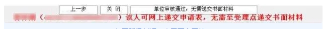 单位审核至最后一步(结束前最后一步),请注意页面提示框,如提示:“该人可网上递交申请表,无需至受理点递交书面材料”,则不需送材料来窗口。例如下图: