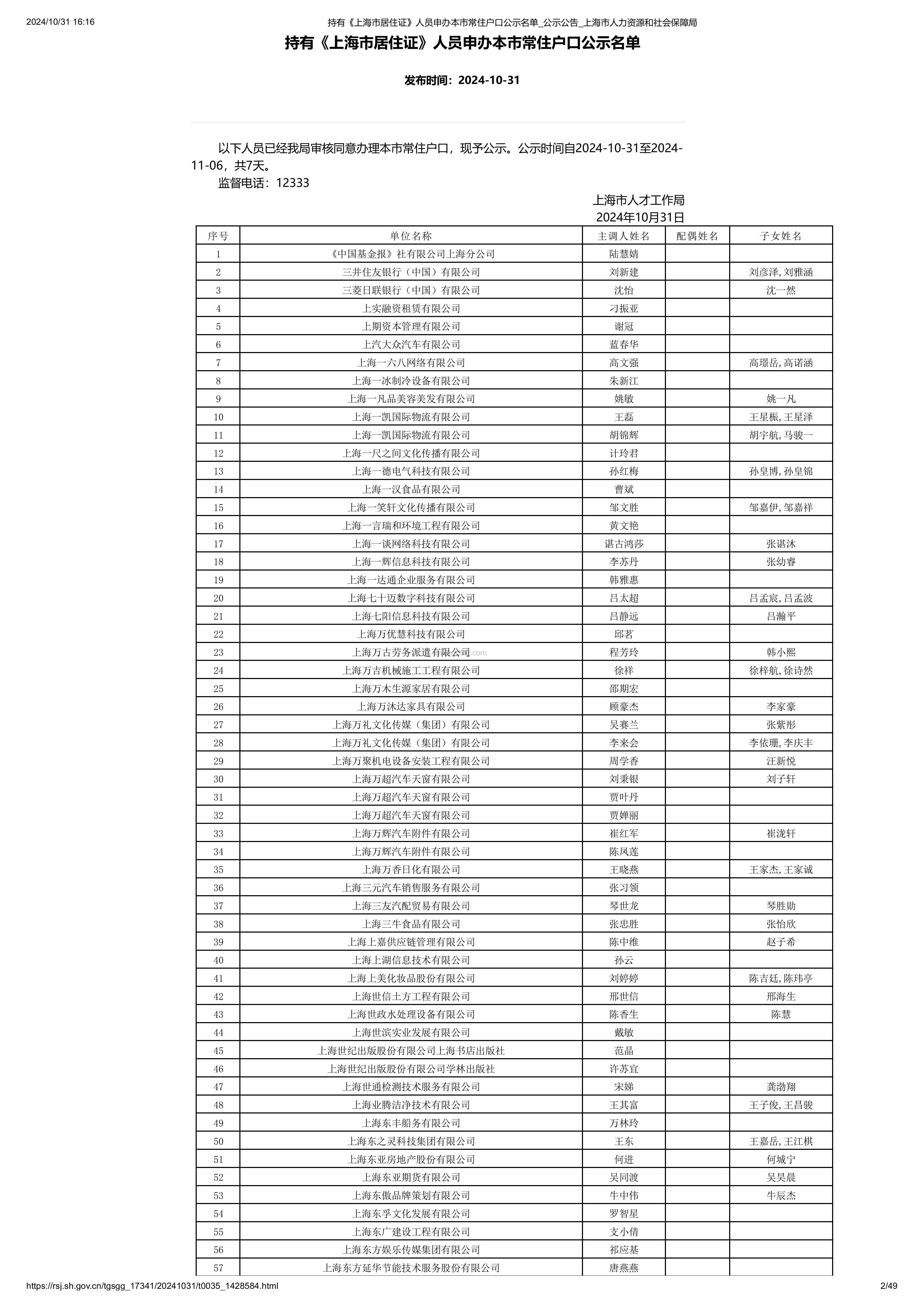 10月31日,上海市人社局发布了2024年10月第2批上海居转户公示名单,共有3181位朋友进入公示,快来看看这一批名单里面有你的名字嘛!此次落户上海名单公示时间自2024-10-31至2024-11-6,共7天。